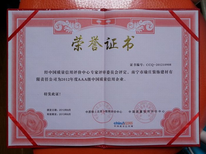 中國(guó)質(zhì)量信用AAA級(jí)企業(yè)證書(shū)